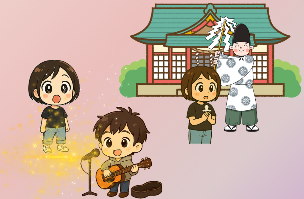 神主さん、祝詞の声、太鼓の音、お祭りでの笛の音、